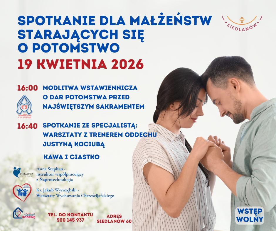 Spotkanie dla małżeństw starających się o potomstwo Ania Stephan 14 kwietnia, 2026 Uncategorized Nawigacja wpisu Poprzedni Poprzedni wpis: Rekolekcje dla kobiet Pratulin 29-31 maja 2026